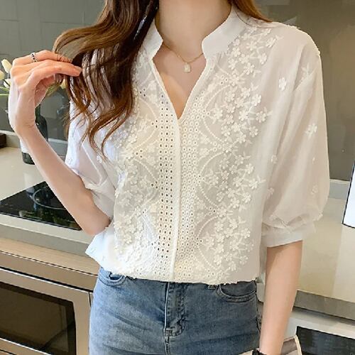女性用半袖刺繍コットンブラウス,Vネックトップ,サマーウェア,ホワイトシャツ,ニューファッション,14204, 2024