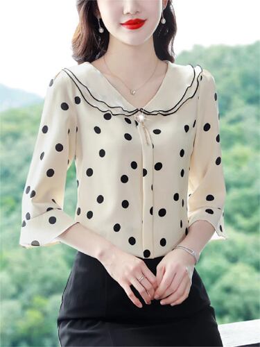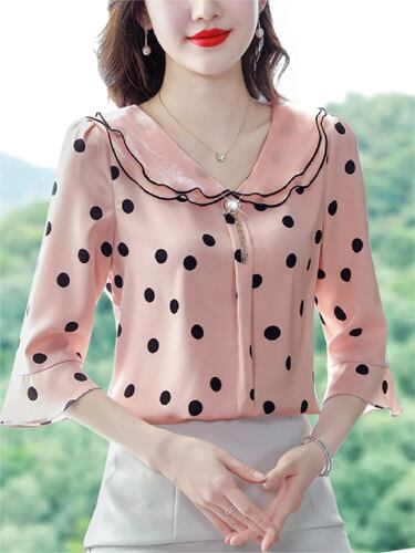 女性用フリルサマーブラウス,水玉シャツ,カジュアルスタイル,半袖,フリルカラー,MD0216