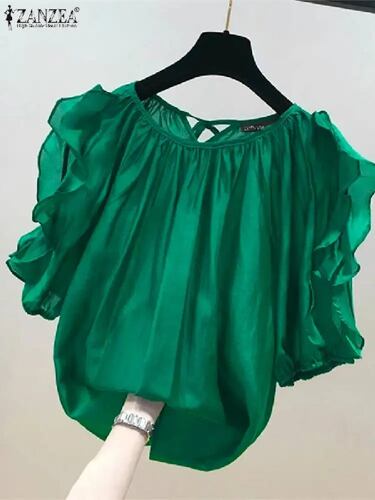 Zanzea-女性用のコールドオフショルダーブラウス、フリルハーフスリーブトップス、シックなバックストラップ、プリーツチュニック、ルーズシャツ、カジュアルファッション、夏