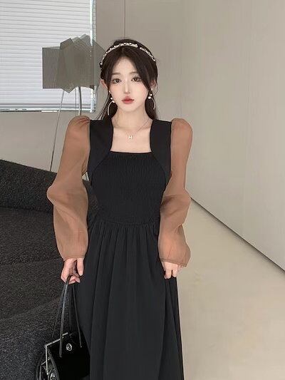 人气 新作 ロングワンピース エレガント ロングスリーブ ワンピース 2024 秋 新しいスタイル スクエアネック 薄手 ドレス