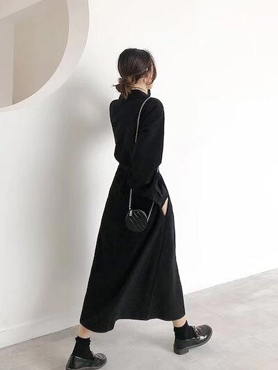 人气 新作 ロングワンピース ブラック ロングスリーブ シャツ ドレス 女性 秋 2024 新しいスタイル
