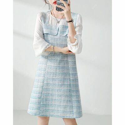 ワンピース フェイク2ピース 2024 秋 ロング 大きいサイズ 薄手 ゆったり ブルー&ホワイト ドレス