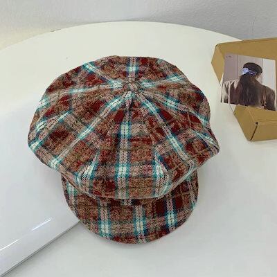 春キャップ 秋と冬 新作 レトロ チェック柄 八角形キャップ 女性 小顔見せ アヒルの舌キャップ