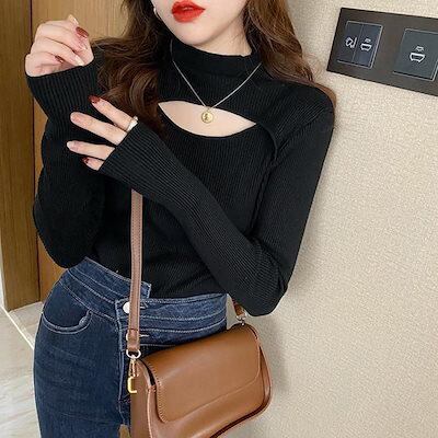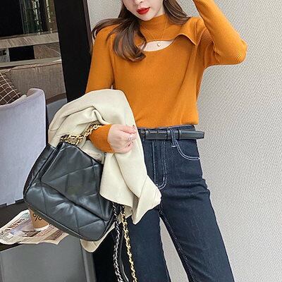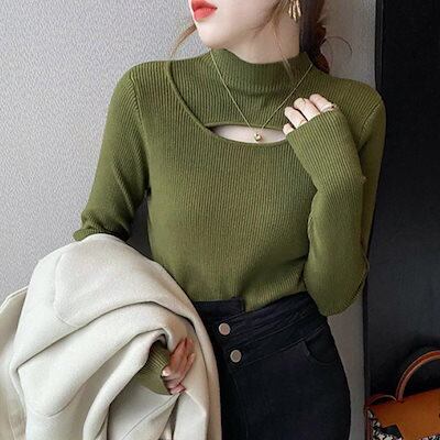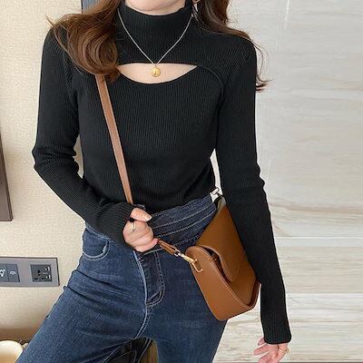 ニットトップス 胸開き プチハイネック おしゃれ ベーシックニット