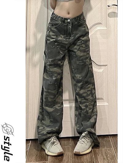 ワイドパンツ ジーンズ レディース 春秋 カモフラージュ ストレート ズボン ゆったり ワイドレッグパンツ