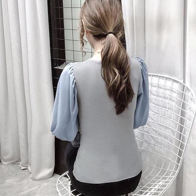 バルーン袖 リブニットトップス 韓国風 シフォン アンダーウェア