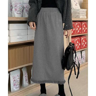 【 3日で出荷 】ハーフスカート ロングスカート 裾フリンジニットスカート