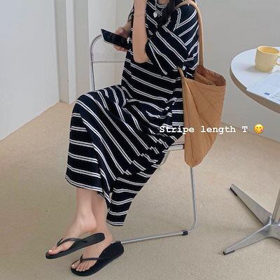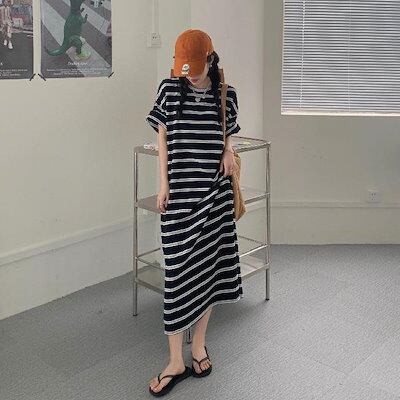 ワンピース レディース 2024夏のストライプワンピース韓国版ゆったりカジュアルTシャツゆったりロングスカート ドレス 韓国ファッション