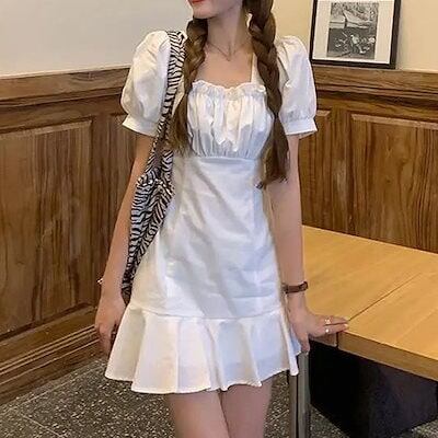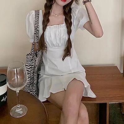 ワンピース レディース ショート丈ワンピース2024新型フリルシュシュウエストエンド襟A字バッグヒップスカート ドレス 韓国ファッション