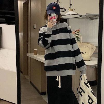 パーカー 韓国ファッション長袖レディース新作パーカー ゆったりスウェット ブラウス ストライプ長袖トレーナーレディース ゆったり韓国学生小さなプルオーバートップ 韓国ファッション