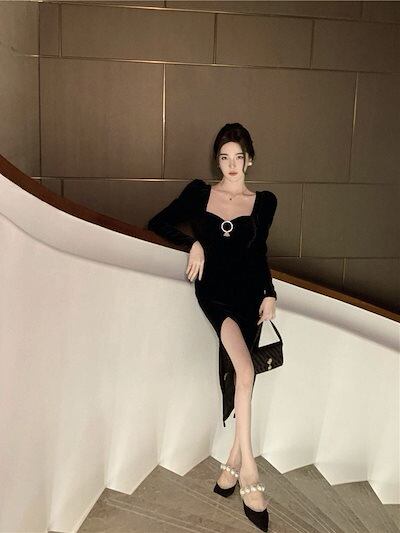 ロングドレス 韓国ファッション 礼服 ドレス パーティードレス レディース パーティードレス 新作 ベルベット ブラック ワンピース ドレス スリット ワンピース発表会 二次会 演奏会