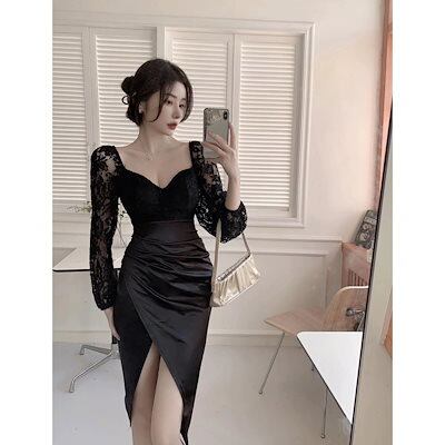 ロングドレス 韓国ファッション 礼服 ドレス パーティードレス レディース ブラック ワンピース 着痩せ レディース セクシー スリット タイトスカート セミロング パーティードレス
