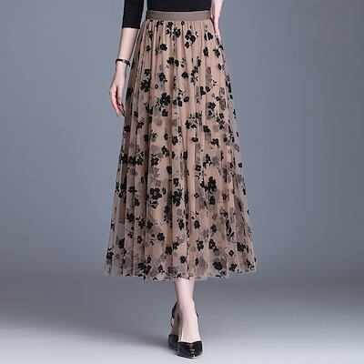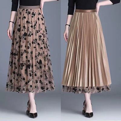 プリーツスカート 韓国 両サイドに網掛け 半身スカート で細く見えるミディアム丈 ハイウエスト マキシスカート レディース