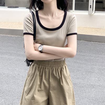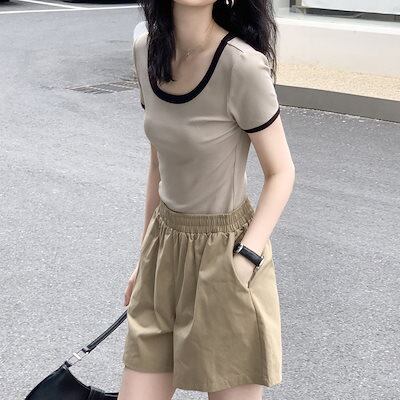 Tシャツ トップス 高級感 プラス肩 夏 雰囲気ショート 2024新型 ファッション ハイウエストぶつかり色 Uネック 半袖 レディース 韓国ファッション
