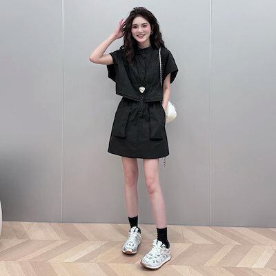 【3日以内出荷】涼しく楽ちんセットアップ 工装半袖+ミニスカート夏のゆったりとしたカジュアルなロープ引きで腰を収めて痩せて見える レディース 韓国ファッション