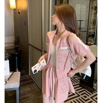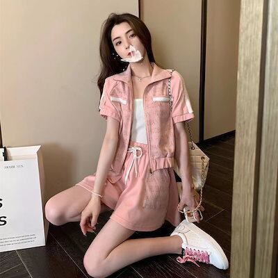 2024 夏 新作 ピンクカジュアルpoloネック半袖セットスポーツショーツ2点セット 百掛け 韓国ファッション 涼しく楽ちんセットアップ レディース