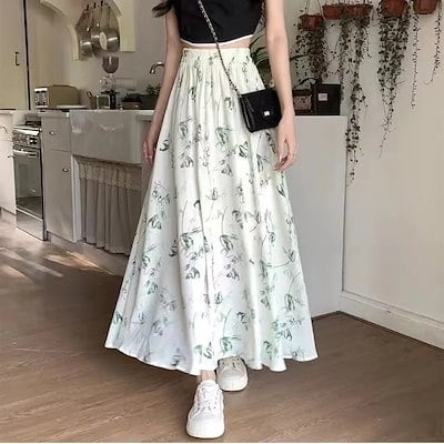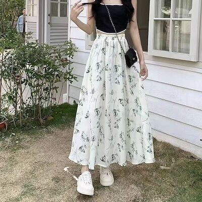 a字半身スカート夏2024新型ゆるやかハイウエスト花柄中ロングスカート垂れ感カバー落書き傘スカートins レディース 韓国