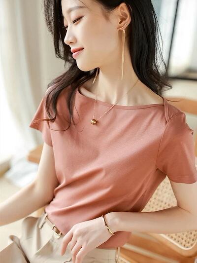 Tシャツ 気質 鎖骨 半袖 夏の新 着痩せ トップス レディース 韓国ファッション