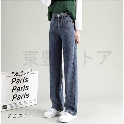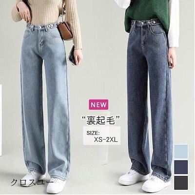 レディース 秋冬新作 ポケット付き 体型カバー ハイウエスト 美尻 ゆったりストレート ジーンズ ワイドデニムパンツ 裏起毛 寒さ対策