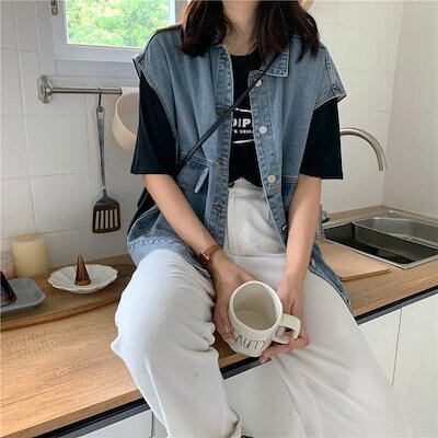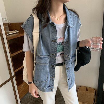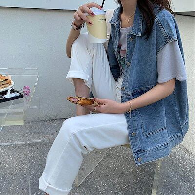 デニムベスト レディース ゆったり 前開き デニム ジレ デニムジャケット ノースリーブ アウター トップス カジュアル 前開き 着痩せ