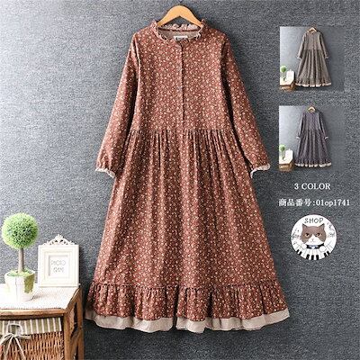 新作登場 ワンピース 花柄 ロングワンピ ワンピ ロングワンピース レディース ロング丈 フレア 長袖 Aライン フリル ギャザー おしゃれ きれいめ 体型カバー 30代