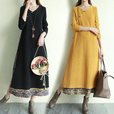 ワンピース エスニック風ワンピース ワンピ ロングワンピ レディース 長袖 重ね着風 手作りボタンフ