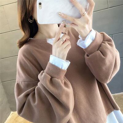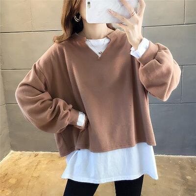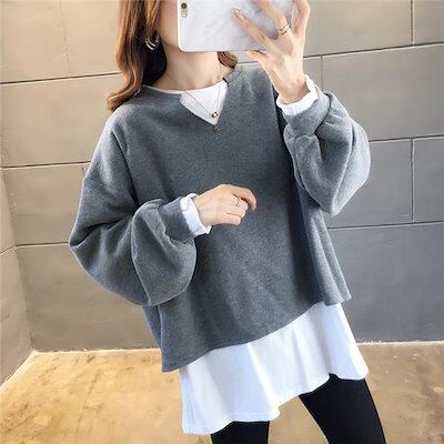 パーカー レディース スウェットトレーナー 着重ね プルオーバー パフスリーブ トップス 長袖 ゆったり レイヤード 秋 カジュアル 無地 きれいめ