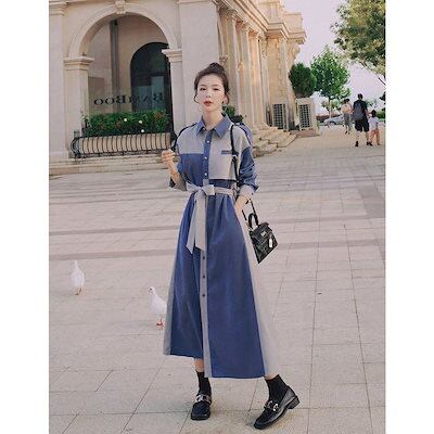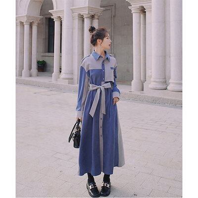 ロングワンピース 秋 Aライン シャツワンピース ワンピース ベロア レディース パッチワーク