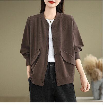 スタジャン レディース 長袖 秋アウター 無地 ブルゾン スウェット カーディガン 春秋 ジャケット トップス ノーカラー ジャンパー アウター カーデ 羽織り 前開き シンプル 定番 カジュアル 大