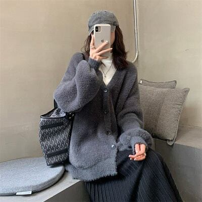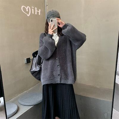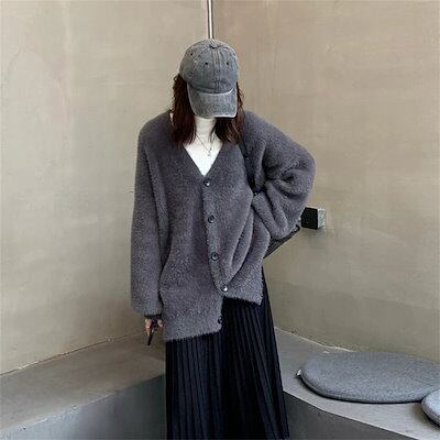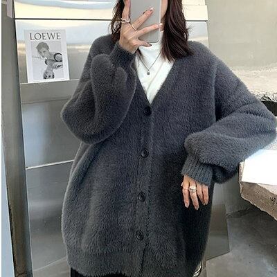 ニットカーディガン レディース 秋冬 Vネック ニットカーディガン トップス 大きいサイズ アウター 羽織 前開き 体型カバー 厚手 暖かい ゆったり キレイめ 大人 かわいい カジュアル グレー ホ