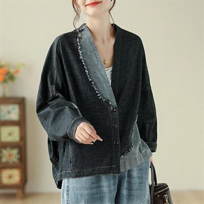 カーディガン デニム ジャケット レディース 秋 切替 デニム アウター カーディガン トップス ノーカラー 大きいサイズ 羽織る アウター ゆったり シンプル キレイめ お洒落 体型カバー カジュア