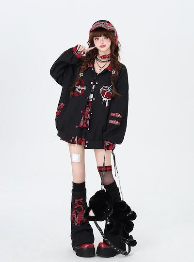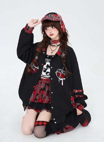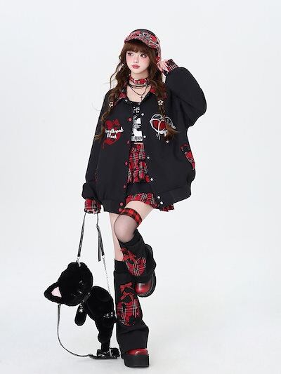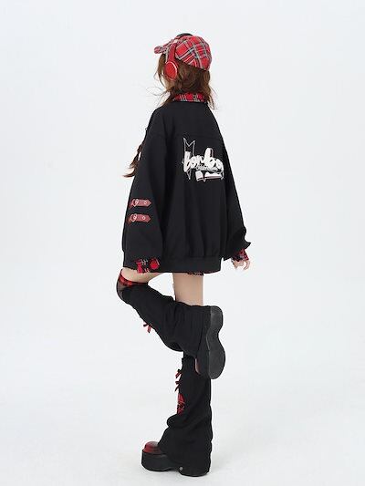 ジャケット サブカルプリントプレイドスプライスベースボールジャケットブラウストップルーズ秋冬レディースジャケット