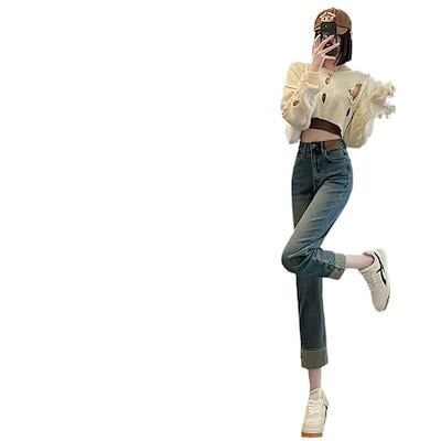 デニムパンツ ヴィンテージジーンズ女性ルーズ2024新しいハイウエスト9点弾性ストレートズボンの秋