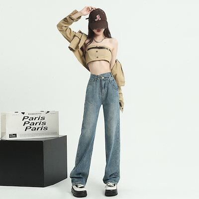 デニムパンツ ヴィンテージストレートジーンズ女性ハイウエストルーズワイドレッグデニムパンツ