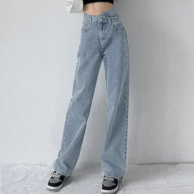 デニムパンツ レディース ジーンズ ストレートデニム ウエストレイヤード風デニムパンツ