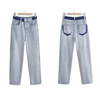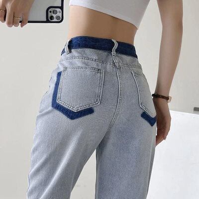 デニムパンツ レディース ジーンズ配色ストレートデニムパンツ ハイウエスト