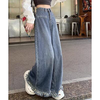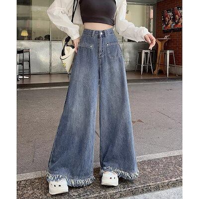 デニムパンツ レディース ジーンズ ワイドデニムパンツ 裾フリンジ ジーパン