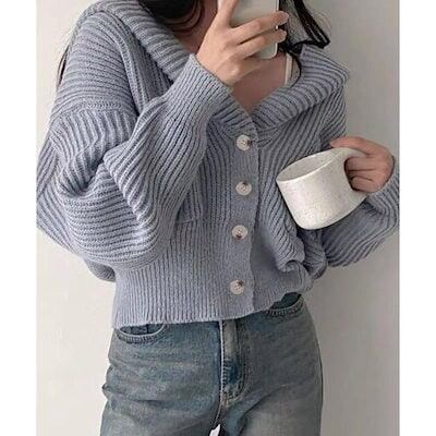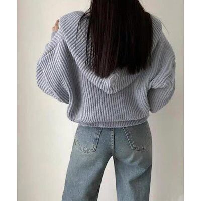 ニットカーディガン 秋冬 リブニット フード付きニットカーディガン ショート丈