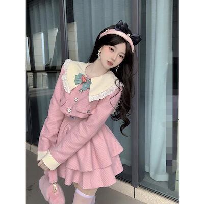 パーティードレス デザイン感 あるキルティングショート丈コート+ウエスト 短いスカートが可愛いピンク スーツ