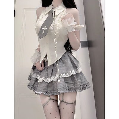パーティードレス 可憐な制服少女 デコルテ修整シャツ+ハイウエストレーススカートスーツ