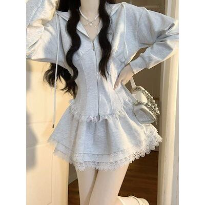 パーティードレス 韓国系ファッションカジュアルレースのキルティングウエストトップスハイウエストスカートスーツ