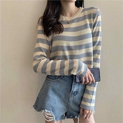 ストライプニット長袖 パーカー Tシャツ秋 新作韓国版ゆったりけだる風ショート丈トップスins潮
