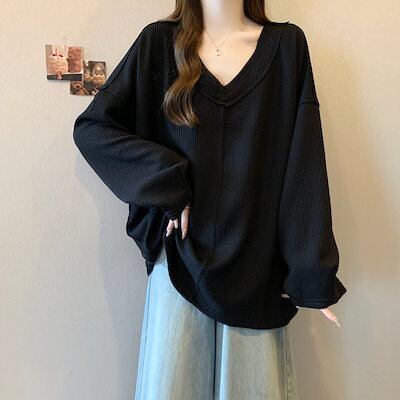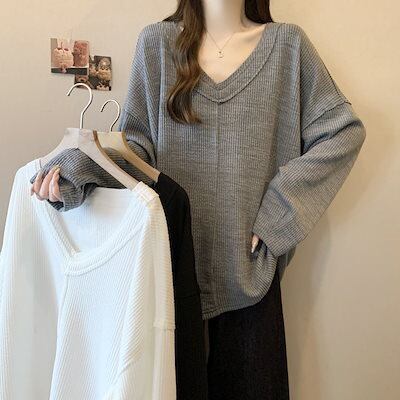 パーカー ストライプ デザイン感Vネック長袖トップス2024 秋 新作ゆったりおしゃれボトムTシャツ女