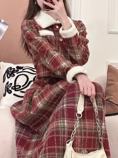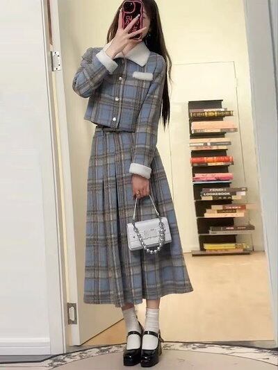 秋冬 レトロ 長袖アウター+ハイウエスト プリーツスカート 2点セット レディースファッション チェック セットアップ ショート ジャケット/ロングスカート