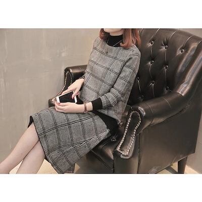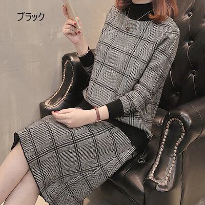 2024 秋冬 ニットワンピース2点セット レディース 40代 長袖 ニットトップス タイトスカート チェック