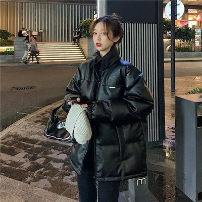 韓国ファッション 冬服 レディース 新作 中綿コート 人気 PU 皮ジャケット ゆったり 厚手 綿服 アウター