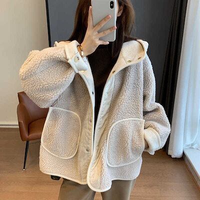 ラムウールのコート女性の秋冬の新毛むくじゃら韓国版ゆったりと厚くて痩せて見えるフード付き洋風トップスウォーム ジャケット