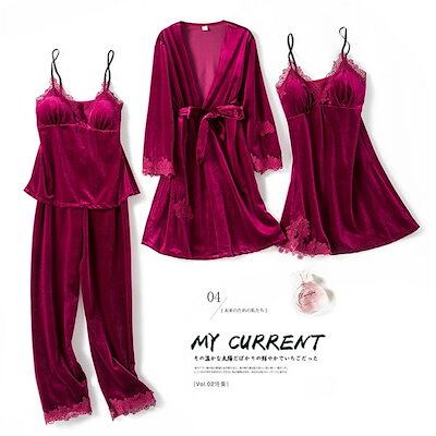 パジャマ ネグリジェ 部屋着 秋冬 長袖ガウン ルームウェア 女性 レディース ルームウェア ロングパンツ 前開き 寝巻き 4点パジャマ ランジェリー ベルベット