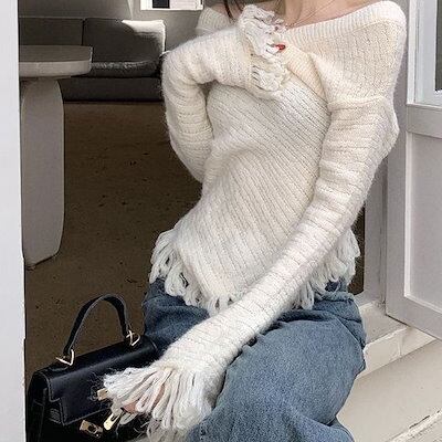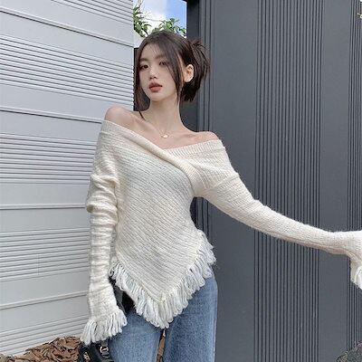 不規則 クロス フリンジ セーター レディース 秋冬 スリム 着痩せ デザインセンス インナー ニット トップス
