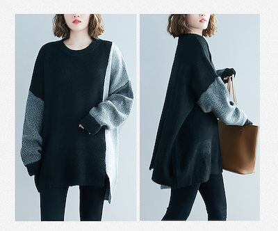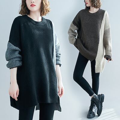 ラウンドネックニット韓国大きいサイズ レディースセーター切り替え文芸ニット アンダーウェアトップス 非対称デザイン丸ネック